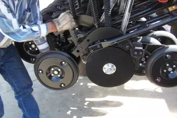 Individual row downforce adjustment maintains uniform seeding depth across the entire drill, even in variable soil conditions. The integral leading gauge wheel simulates a walking tandem. It follows uneven terrain while placing seeds at a consistent depth, which is especially important for small, seeded crops, like alfalfa.