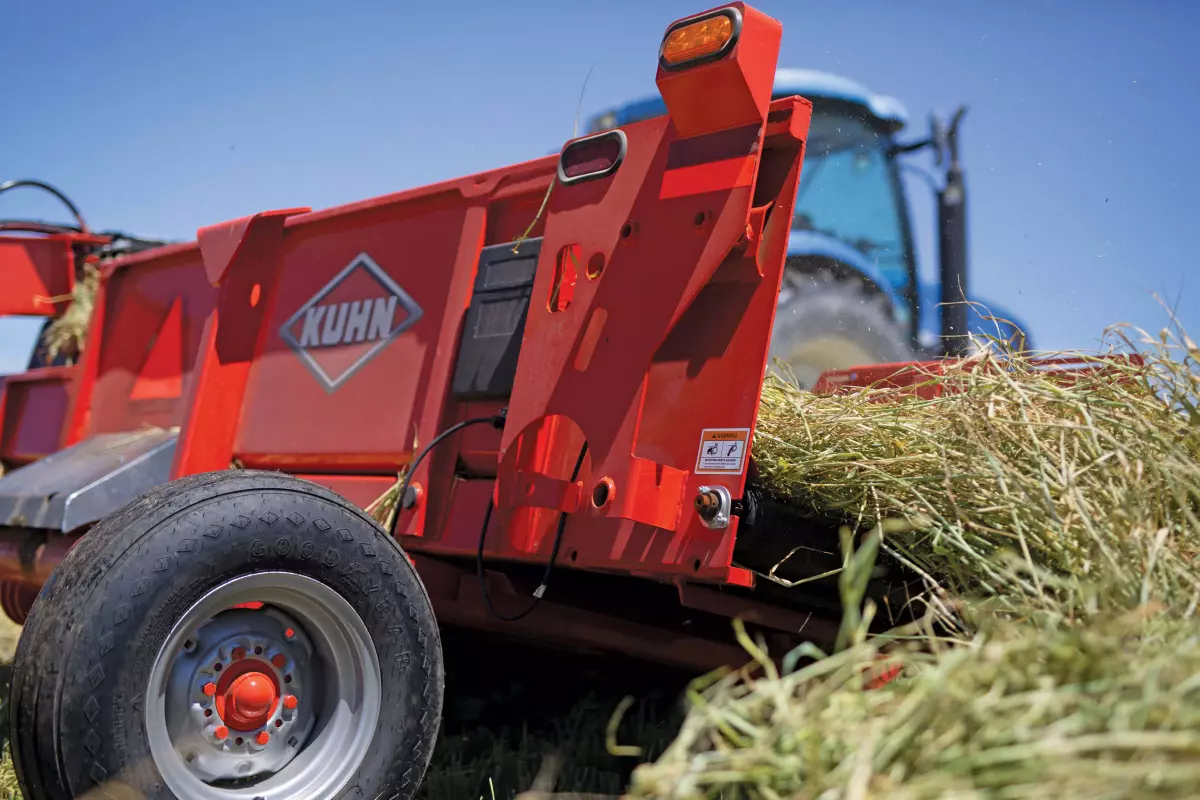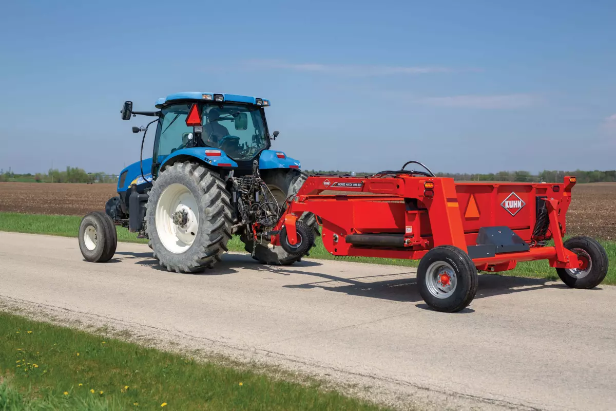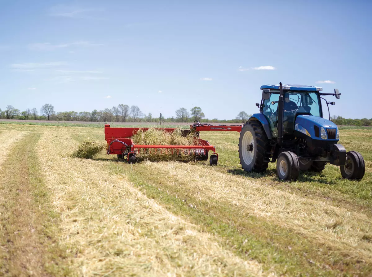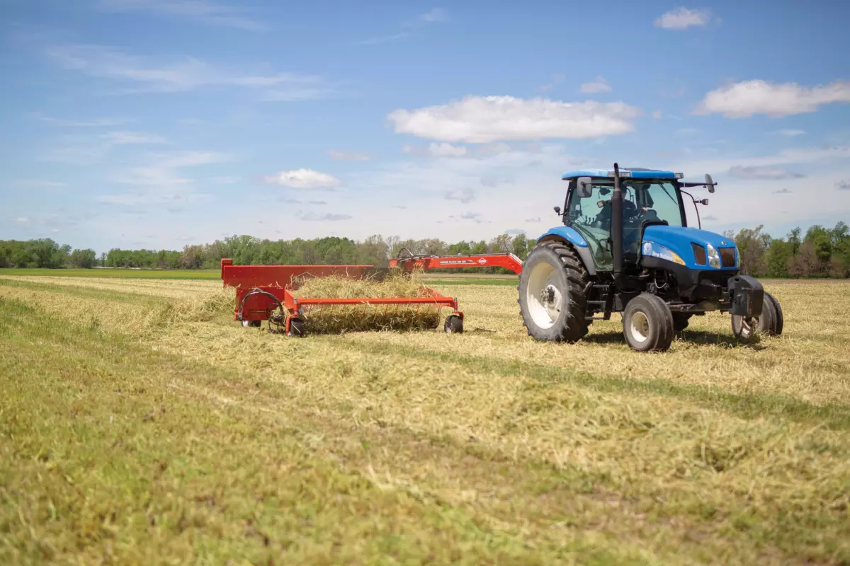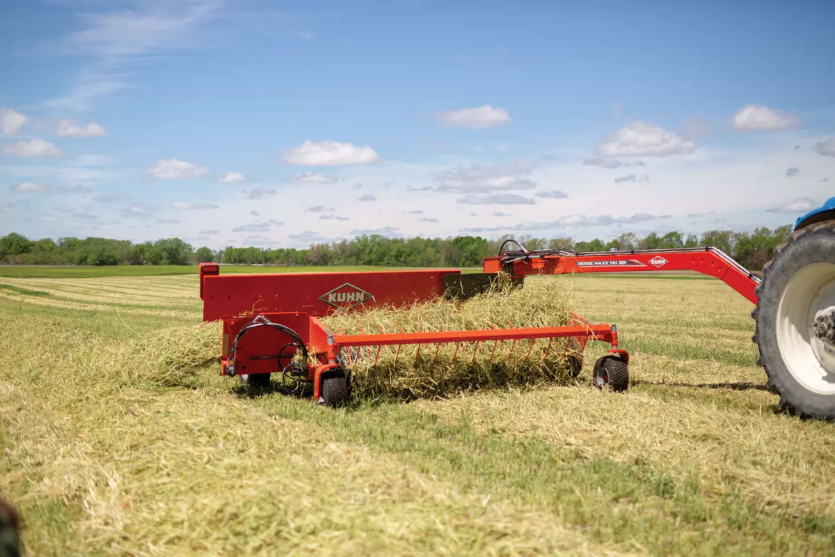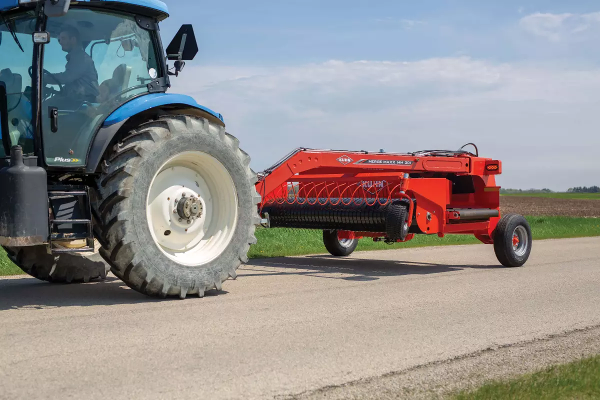 The merger can be operated pulling directly behind the tractor, extended all the way to the right, or anywhere in between for compatibility with various sized mower conditioners.