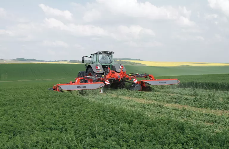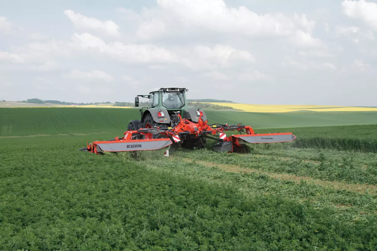 - Gear-to-Gear Power Transmission: Gear-to-gear power transmission, a staple of all KUHN disc mowers, allows for maximum power to be transferred through all gears in the cutterbar. Unlike other gear cutterbars, equal sized gears throughout reduces torque on the gear teeth and leads to unsurpassed reliability and longevity.