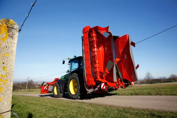 The possibility of lifting both rear mowing units individually via hydraulic cylinders is a big advantage on wedge-shaped fields and permits quick and easy maneuvers. This can be done directly from the cab. At the same time the system ensures a reduced ground pressure: beneficial to plant regrowth, cutterbar wear and power requirements.