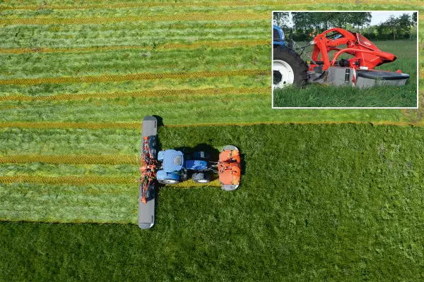 The converging drums work together with the OptiDisc® Elite cutterbar to create smooth swaths, narrow enough to fit between the tractor tires to avoid value robbing run-over of the cut crop. Drums are powered via shafts to ensure full power in all mowing conditions.