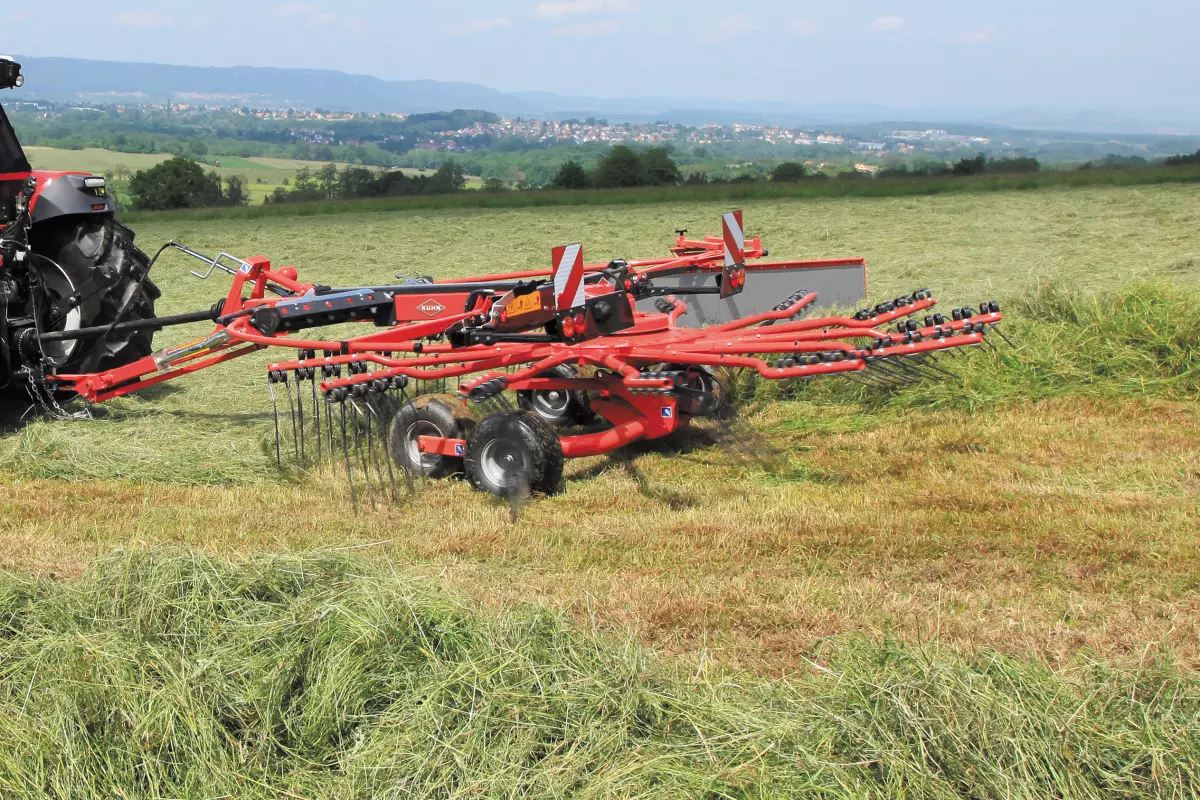 KUHN rotary rakes achieve this by following two basic principles for ideal windrow formation. First, the tine arms maintain a positive forward position right up to the point where the forage is delivered to the windrow ensuring gentle crop handling and minimal ash incorporation. Second, a steep cam track allows the tines to be raised very quickly to provide additional clearance over the windrow.