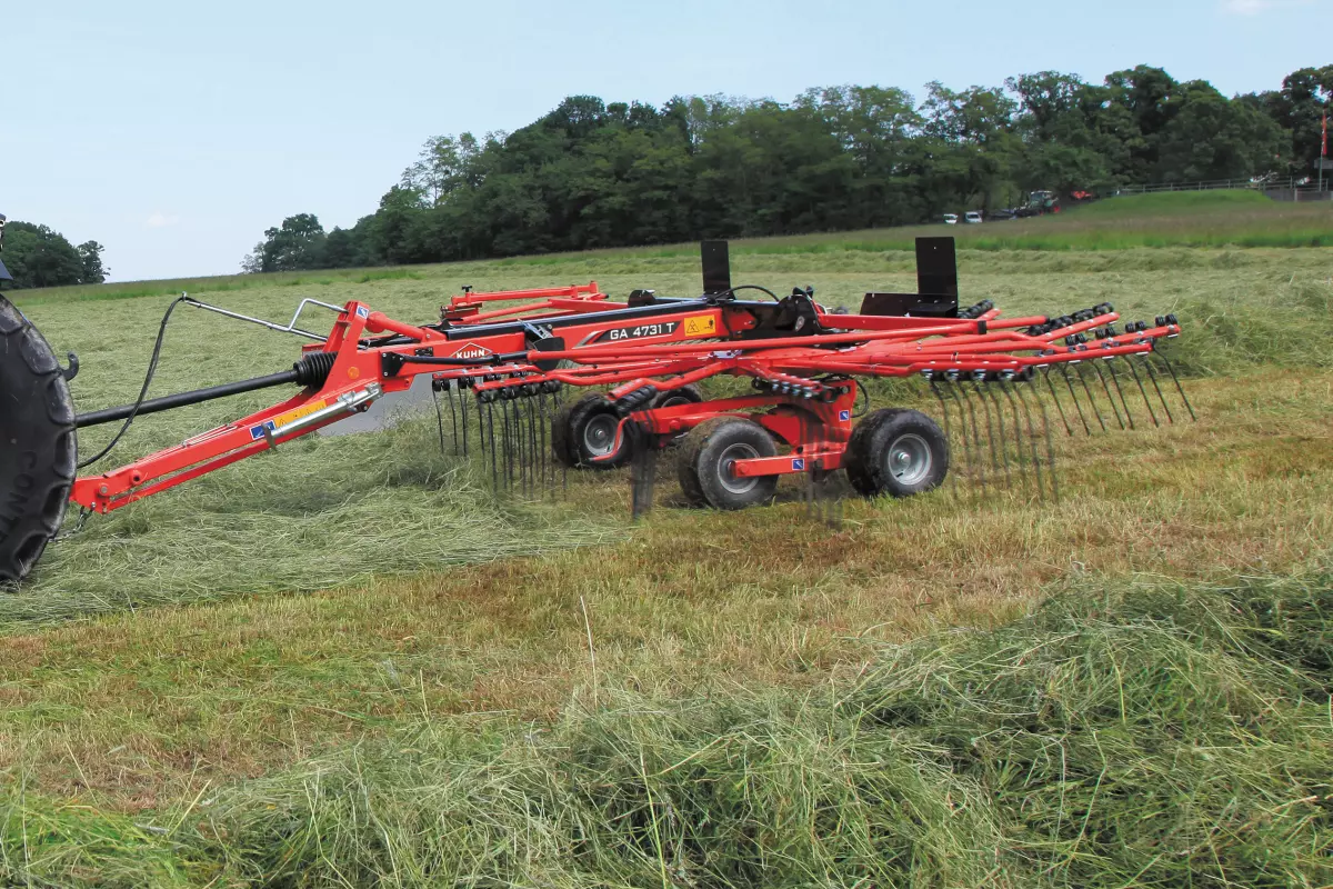 Single-rotor, trailed KUHN GA 4731 and 5031 T rotary rakes, with working widths of 15’3” and 16’5”, have been designed for operators looking to increase their operation’s productivity.