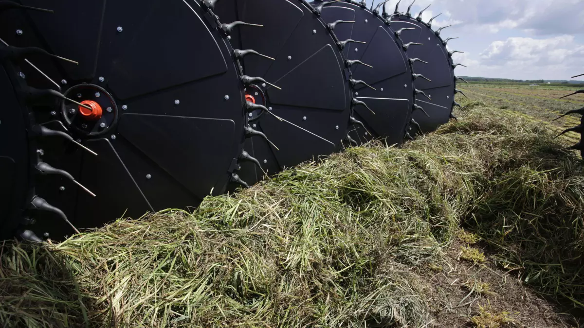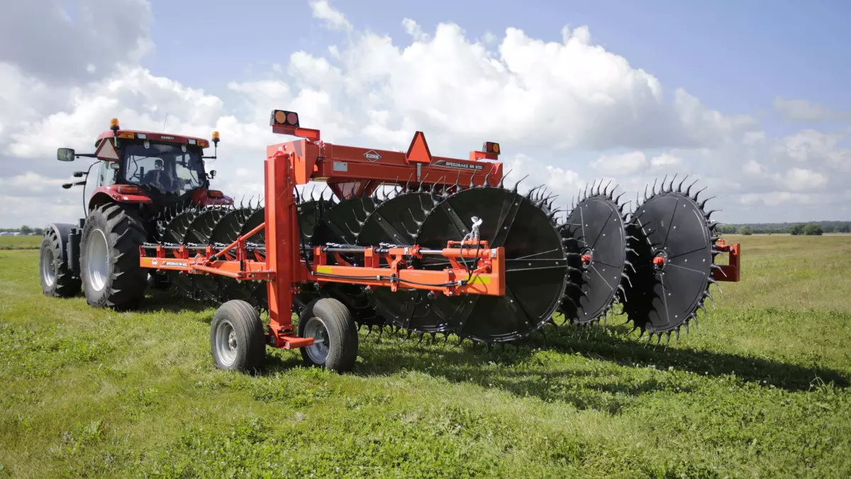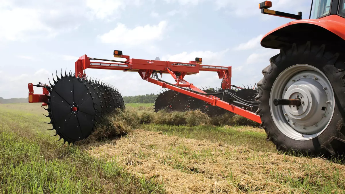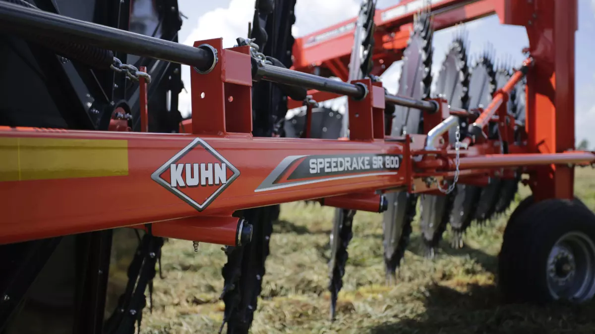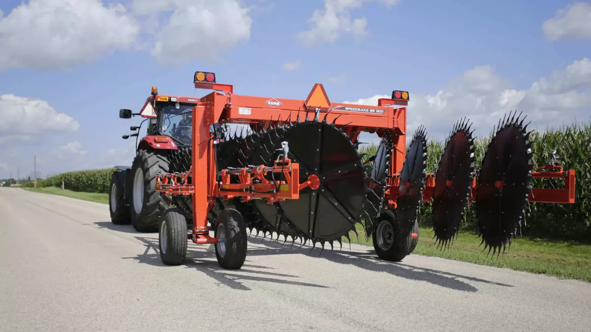 The frame of the SR 800 Series wheel rakes is built with heavy-duty components to ensure a long service life when running in rough field conditions and heavy use. The overhead frame can be extended out to match with any mower size and windrow width.
