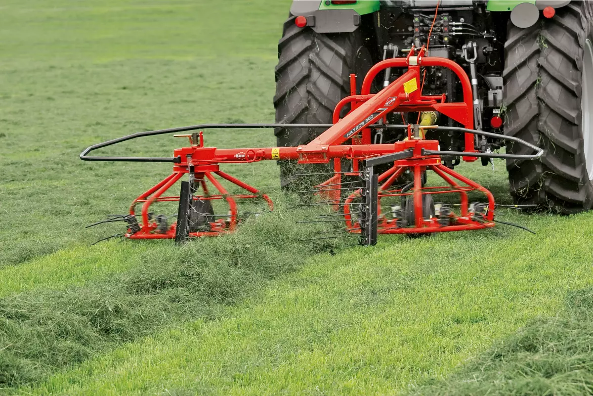 The tine height and rotor pitch angle are quickly optimized for both tedding and raking by adjusting wheel columns and the tractor’s top link to obtain the desired setting.