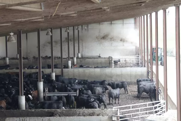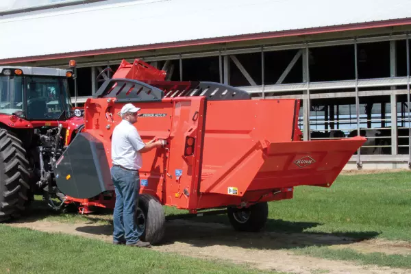 “(KUHN Primor 4270 M bale processor) We drive along the pens, blowing across the entire area of the bedded pack to form a consistent area. It’s very simple to feed the bale into the rotor with a skid steer, and it’s great for creating a uniform distribution.”