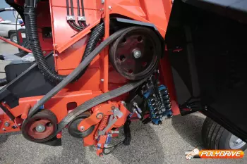 The Polydrive is a hydraulically disengageable belt system that drives the feed rotor. It offers several advantages: