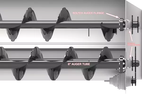 The raised lower right auger configuration, along with the close tolerance between the auger flighting and the auger troughs, results in a fast and complete cleanout. The offset upper right auger in combination with the raised lower auger requires less horsepower and provides a faster mix time.