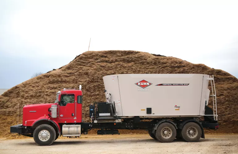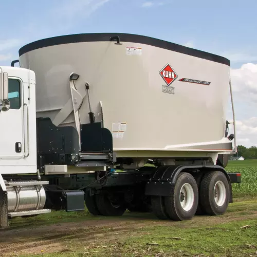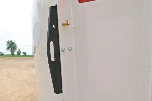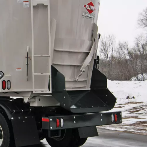 Cone-style augers provide superior feed movement for faster, more complete mixing and processing. The smooth, continuous auger flighting (1) creates a rolling feed action that improves mixing. The top cover of the auger has a steep angle to aid in bale movement when processing round bales and to prevent feed from sitting on top of the auger between mixes. The swept back, bolt-on kicker (2) provides a fast and even discharge. The new kicker mount design is stronger and built to withstand the harshest resistance. Each lead flight is equipped with a cast iron scraper (3) that pulls material away from the tub walls into the auger for a better overall mix. Both the kicker and scraper are bolt-on attachments, making replacement very easy to save you precious time.